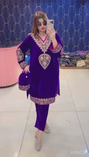 Elevate your festive and winter wardrobe with Article 1104 – Pure Velvet Potli Cordset, crafted from premium velvet fabric and highlighted with beautiful embroidery. This designer coord set comes with a matching potli, giving you a complete luxurious ethnic look. Available in sizes 40, 42, 44, 46 and perfect for weddings, parties, and special occasions.