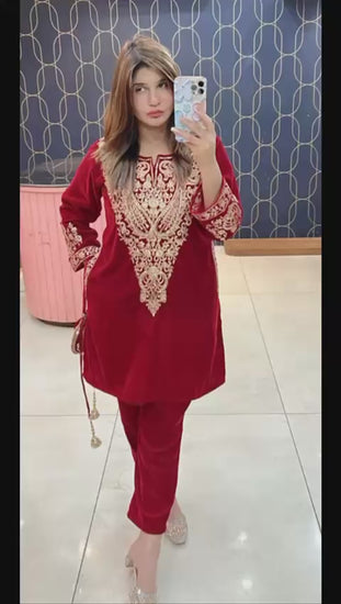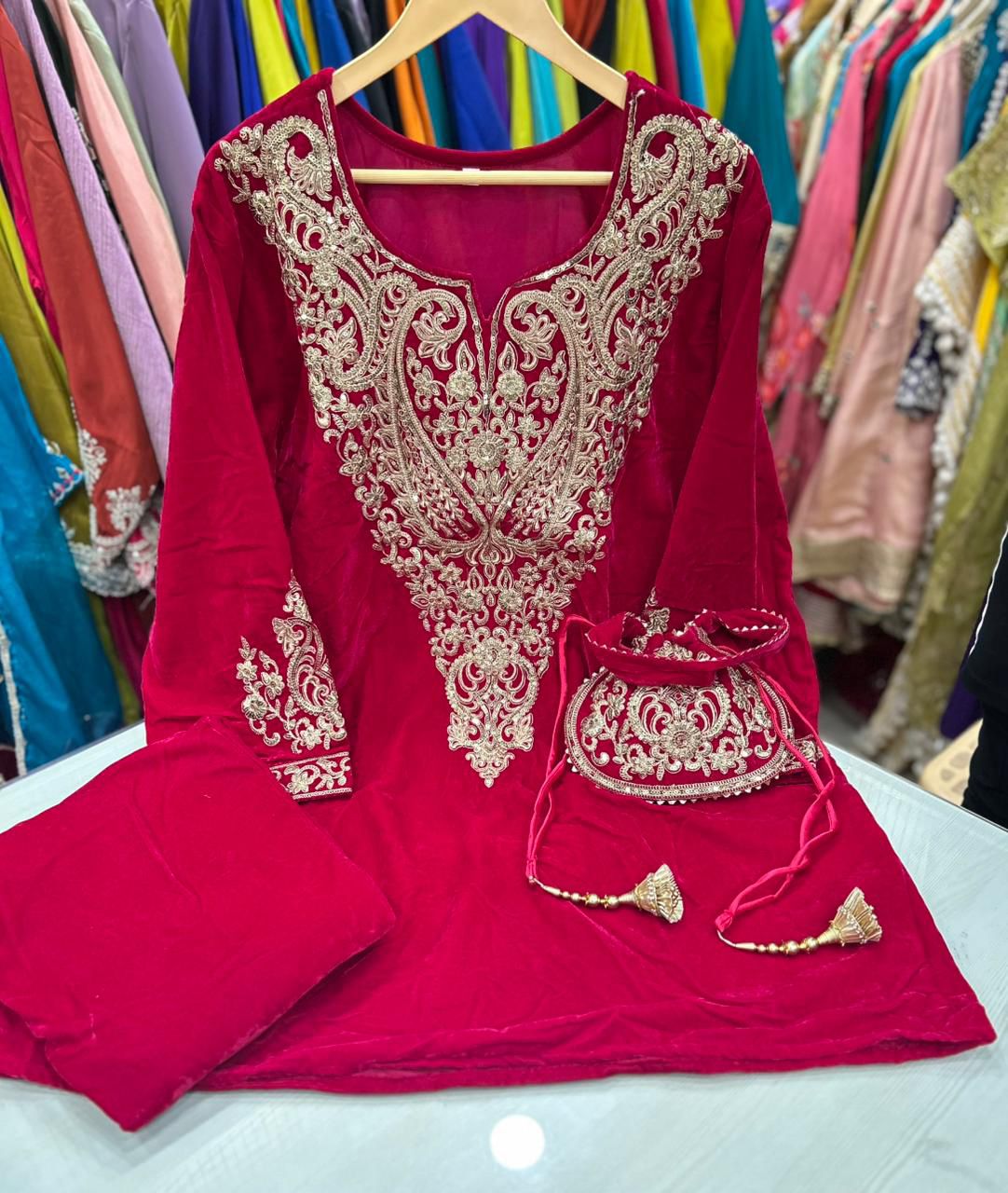 Introducing Article 1166 – Pure Velvet Potli Cordset, crafted from luxurious velvet fabric and highlighted with beautiful hand embroidery. This premium designer coord set comes with a stylish potli, making it a perfect outfit for festive occasions, winter weddings, and evening events. Available in sizes 40, 42, 44, 46.