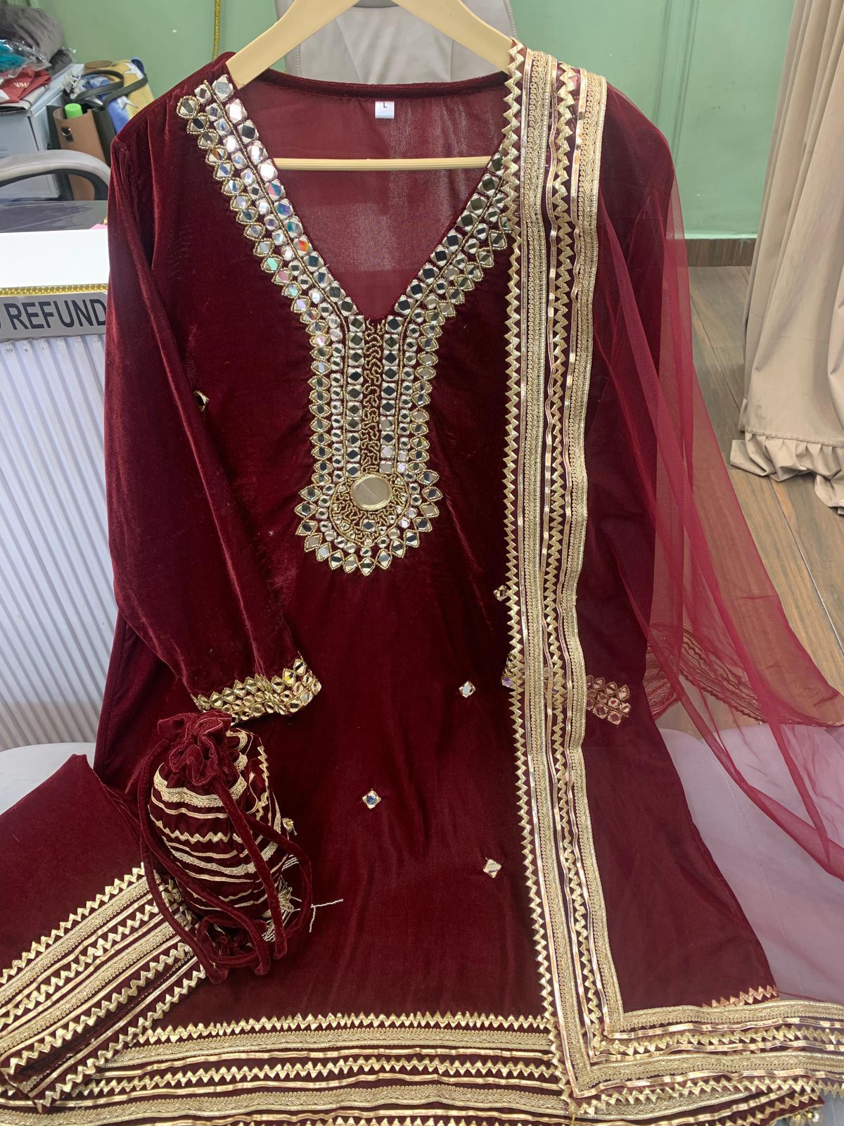 Article 1175 is a luxurious velvet cord set designed for women who love premium and elegant ethnic wear. Crafted from rich velvet fabric, this outfit is highlighted with beautiful real mirror hand work, giving it a stunning festive shine. The set comes complete with a matching potli bag and dupatta, making it a perfect coordinated ensemble. Ideal for weddings, festive celebrations, receptions, and party wear.