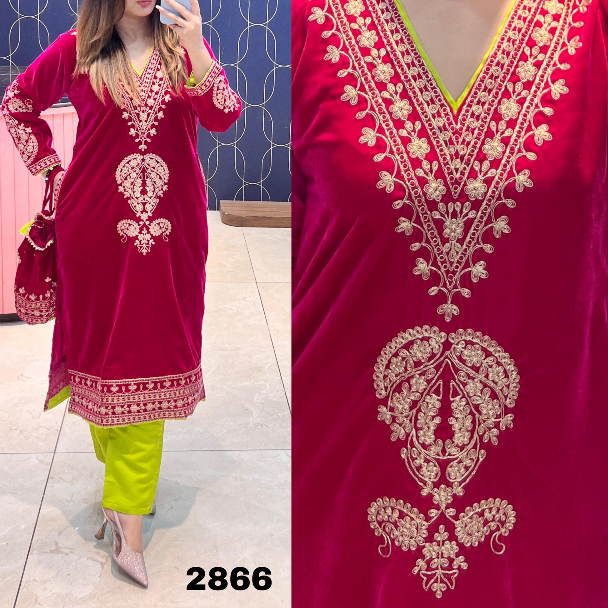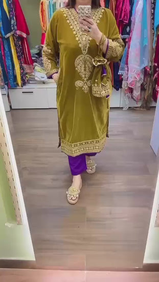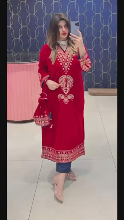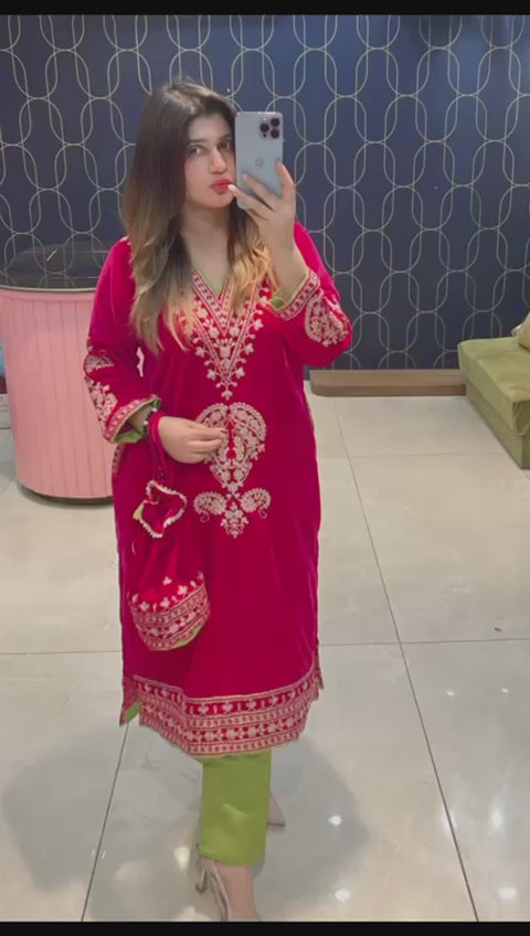 Experience luxury with Article 1191 – Pure Velvet Pakistani Pheran Potli Cordset, crafted for elegance and comfort. This premium velvet set features beautiful embroidery detailing and comes with a matching potli, making it perfect for winter weddings, festive occasions, and royal ethnic styling. Available in sizes 40, 42, 44, 46.