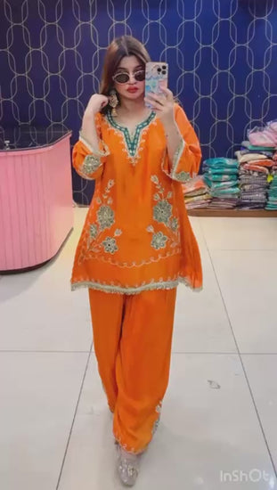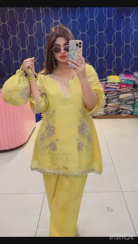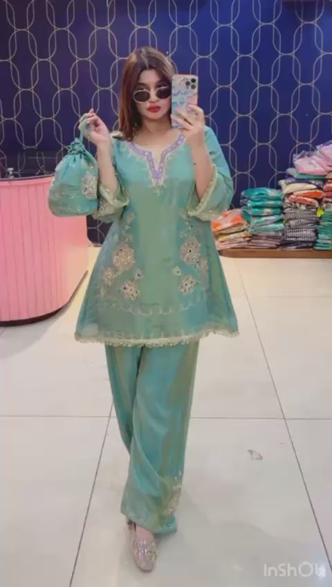 Article 1500 is a stunning designer ethnic set crafted in premium tissue shimmer fabric, perfect for festive and wedding occasions. The outfit is beautifully highlighted with real mirror work and rich gotta patti detailing, giving it an elegant and royal look. It comes with a stylish bell bottom pant featuring embroidery, adding a modern yet traditional touch.