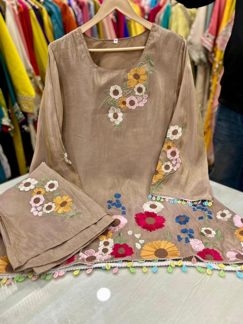 Article 1620 | Tissue Shimmer Fabric Cord Set with Floral Embroidery & Bell Bottom Pants