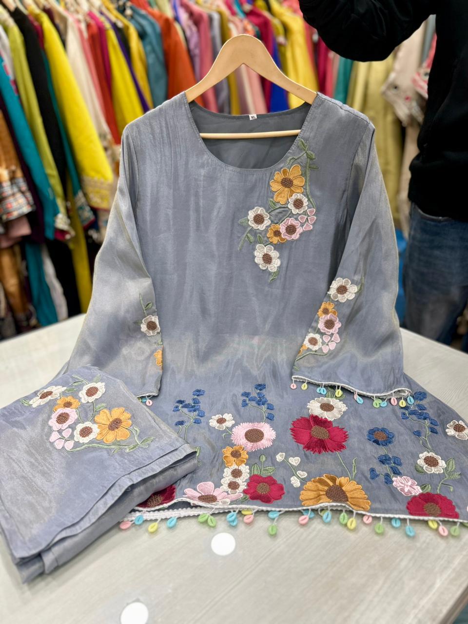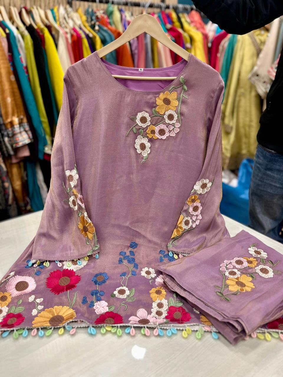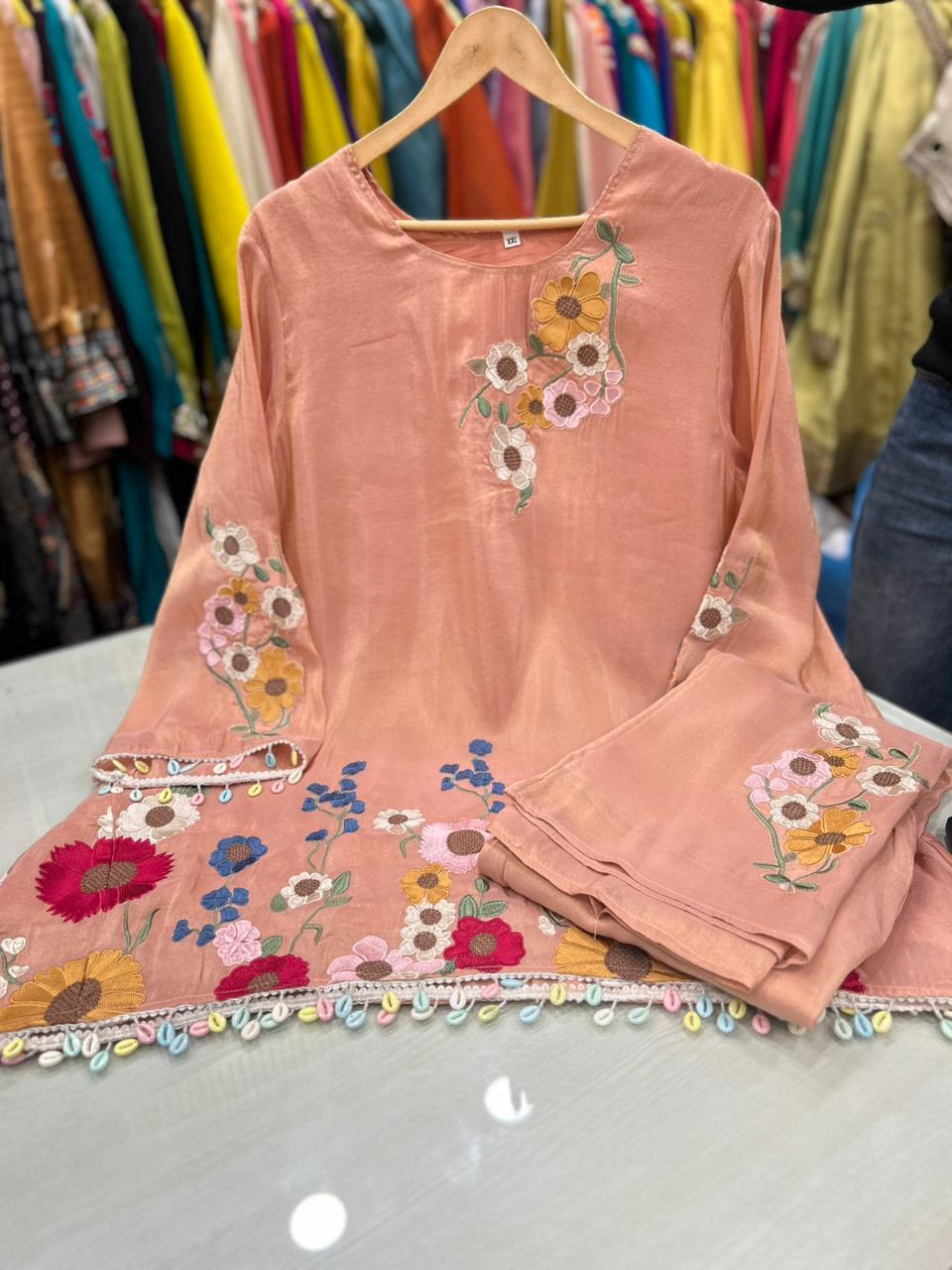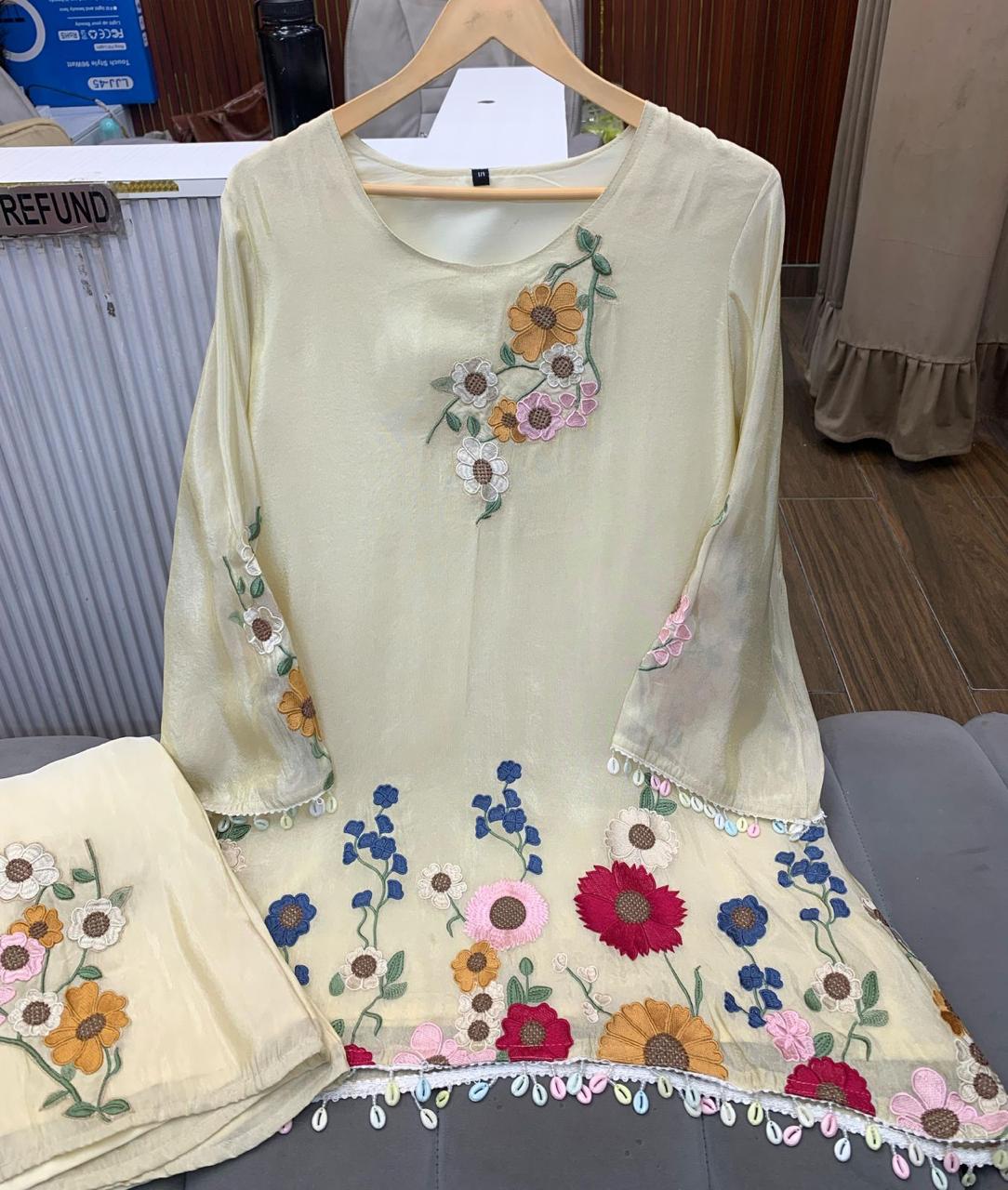 Article 1620 is a stylish Tissue Shimmer Fabric Cord Set, designed to make a statement with its delicate floral embroidery and trendy bell bottom pants. The subtle shimmer fabric adds elegance, while the modern silhouette ensures comfort and sophistication.