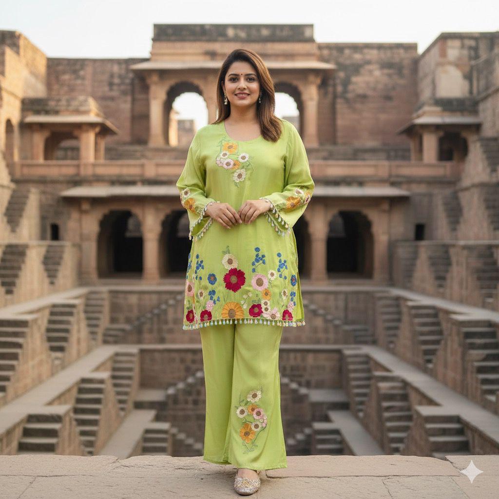 Perfect for festive occasions, parties, weddings, and premium ethnic gatherings, this cord set blends contemporary fashion with ethnic charm.