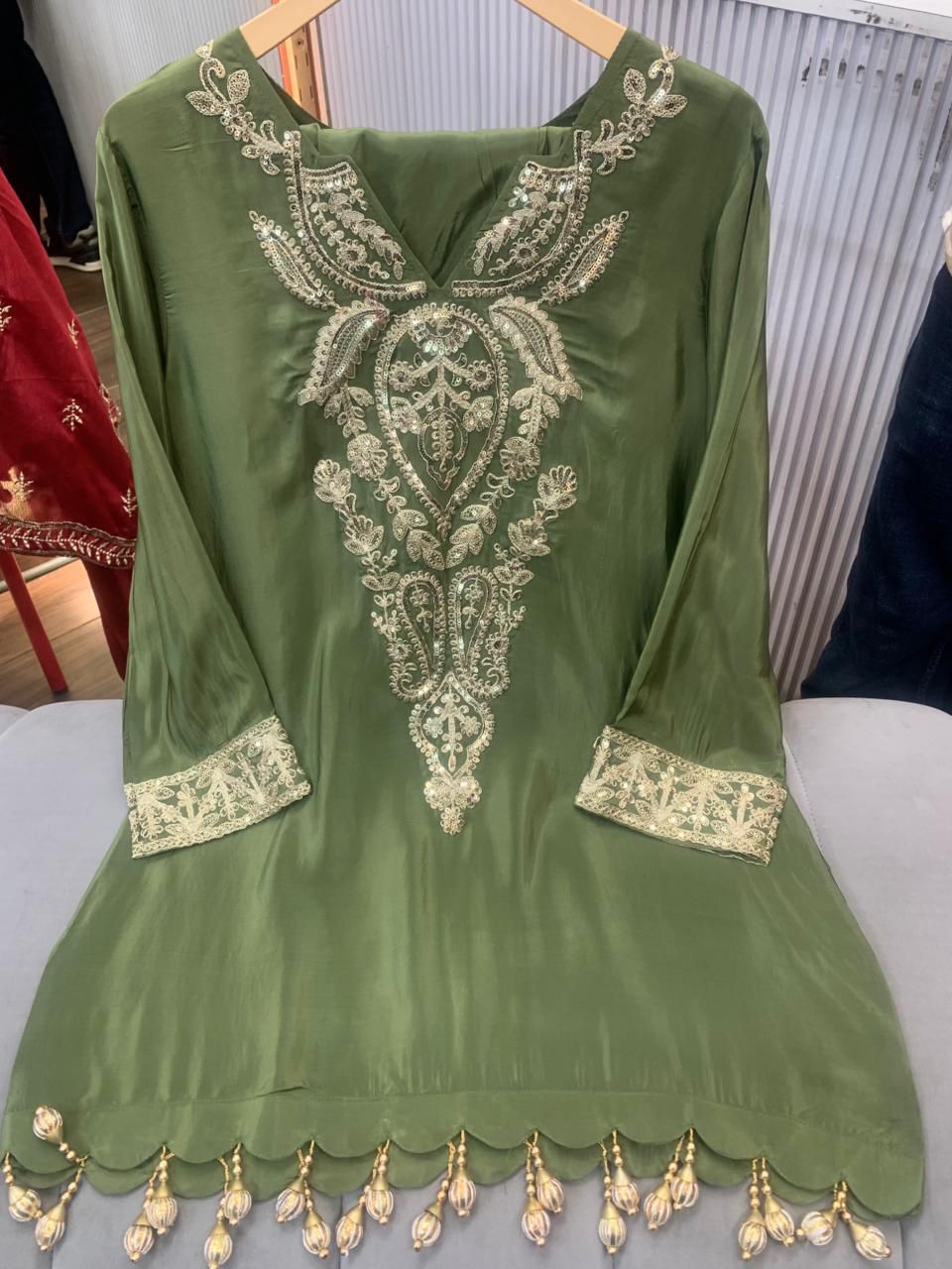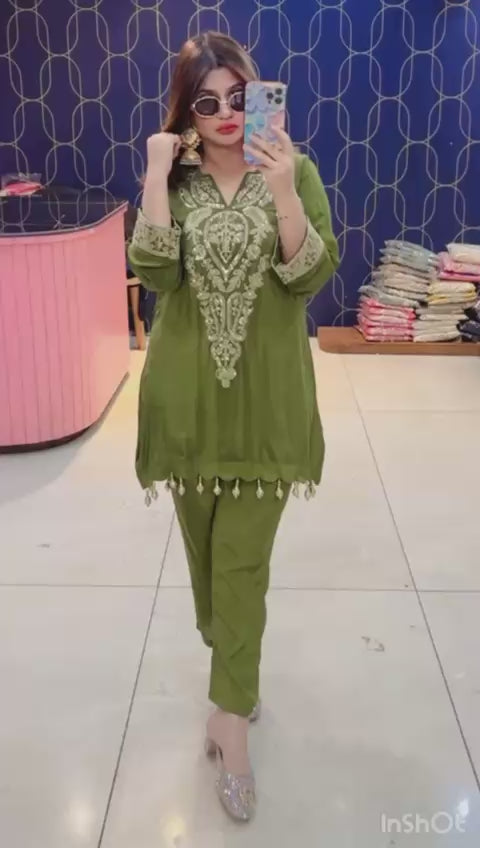 Article 1704 is a stylish pure crepe co-ord set highlighted with beautiful embroidery and tassels, perfect for festive wear, party wear, and elegant occasions. Crafted for premium comfort and style. Available in sizes 40–46. Shop exclusive co-ord sets.