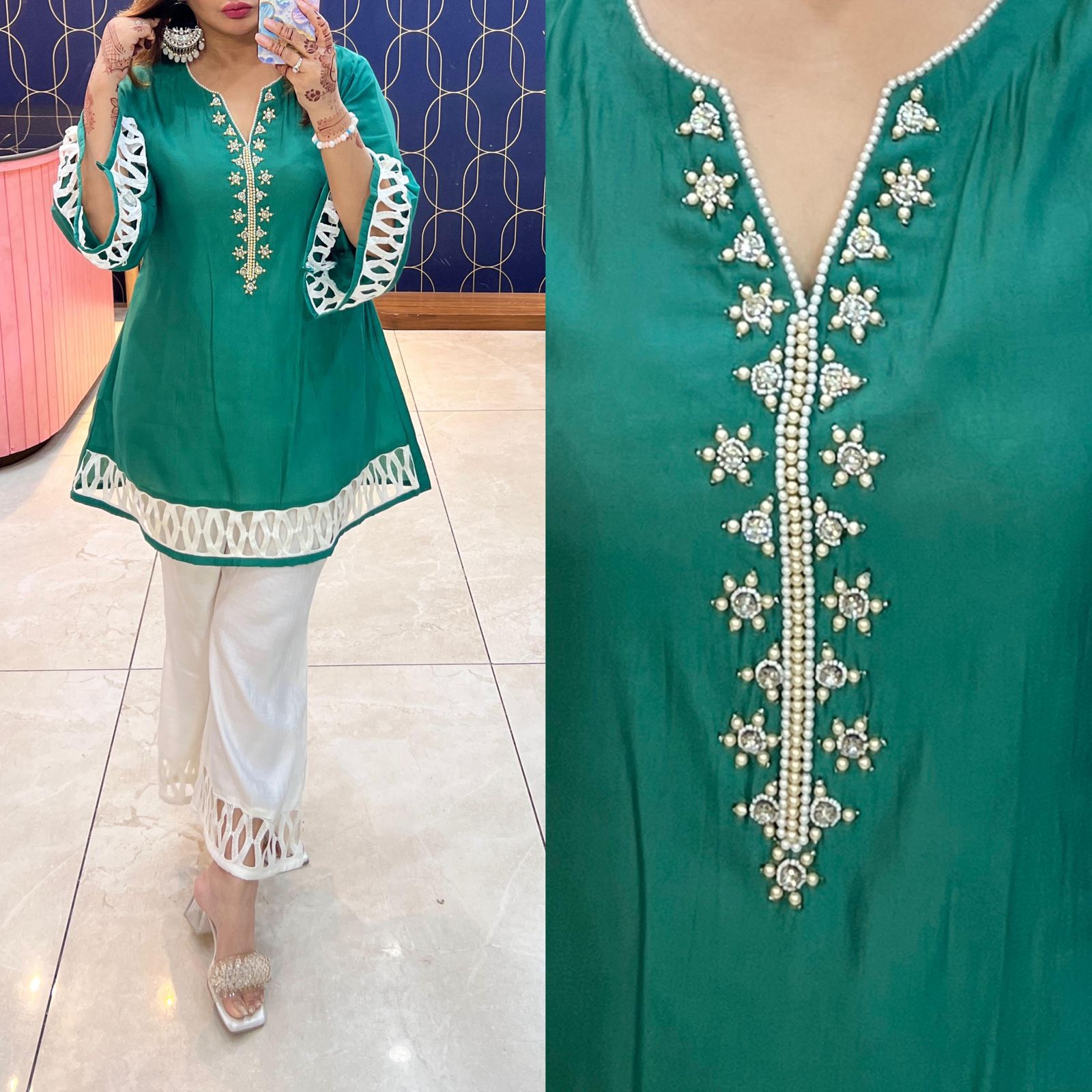 Article 1738 β Cotton Silk Co-ord Set with Designer Crochet Lace, Bell Bottom Pants & Handwork | Sizes 40β46