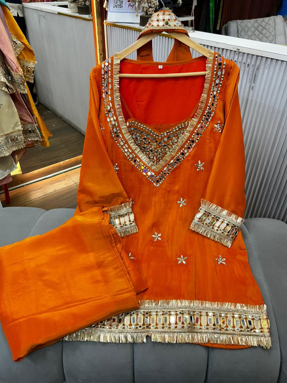 Beautifully highlighted with real mirror work, this set offers elegance, shine, and premium craftsmanship—perfect for weddings, receptions, parties, and festive events.