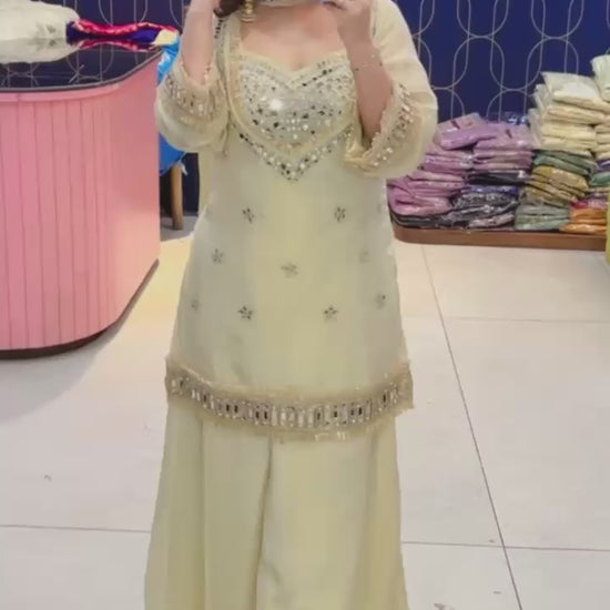 Introducing Article 1768, an ultra-premium Pure Glass Tissue Fabric Bustier Sharara Cordset designed for a royal festive and wedding look. This luxurious outfit features a stunning bustier top, a richly flared sharara, and a stylish choker-style dupatta.