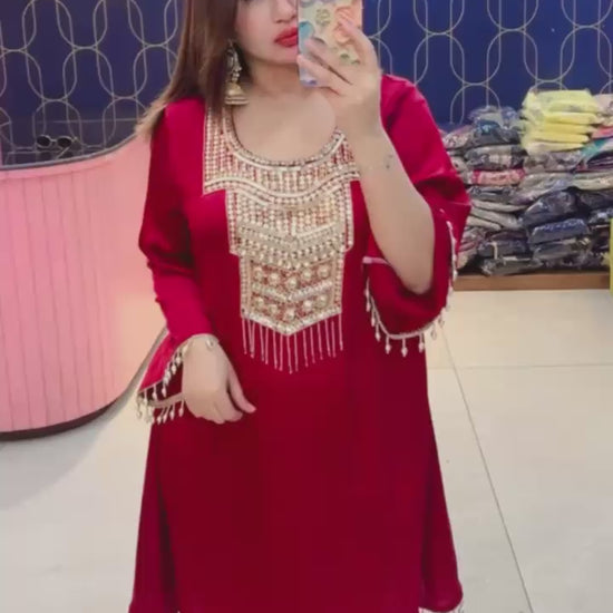 Elevate your style with Article 1873, a premium Imported Crush Fabric Co-ord Set designed for effortless elegance. This chic outfit is beautifully highlighted with intricate handwork, blending luxury and comfort perfectly.