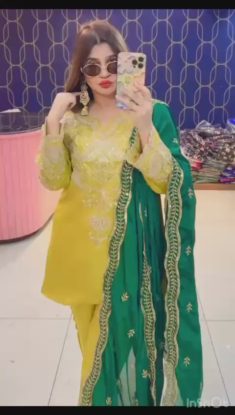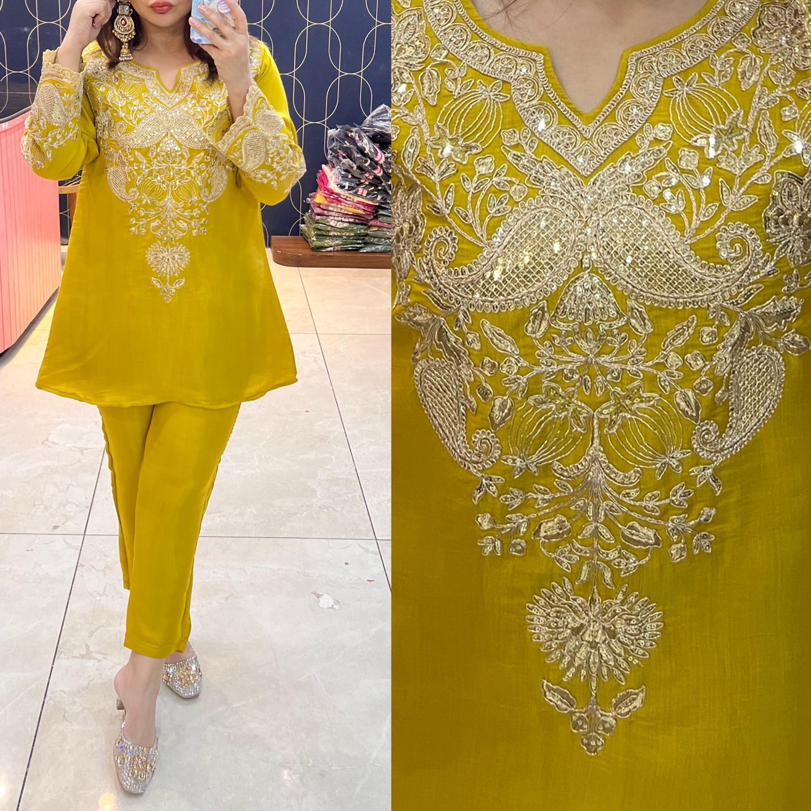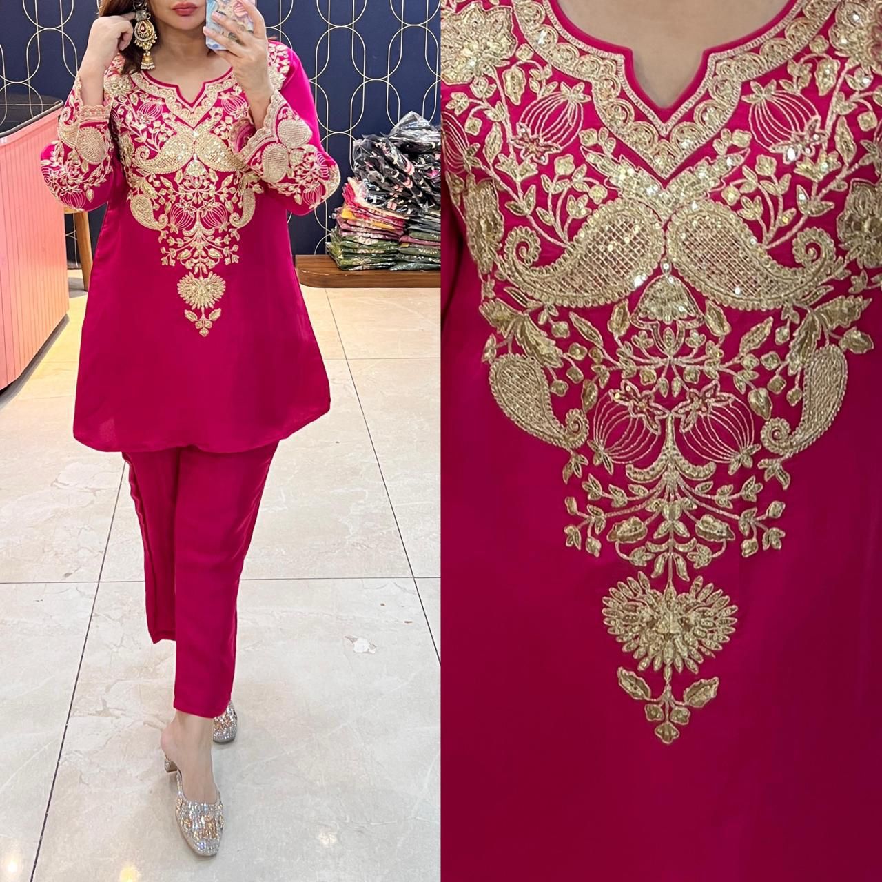 Shop Article 1868, a premium Pure Crepe Silk Cord Set highlighted with elegant embroidery. Optional embroidered Chinon dupatta available for a festive, classy look. Sizes 40–46. Ready to dispatch at Urban Closet.