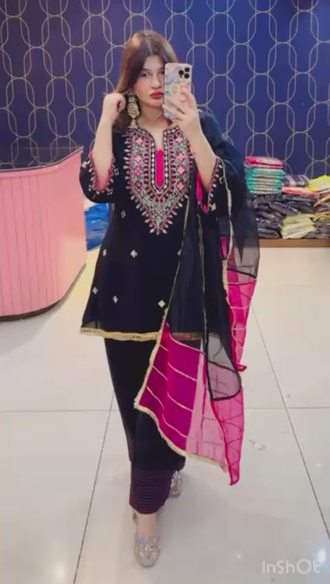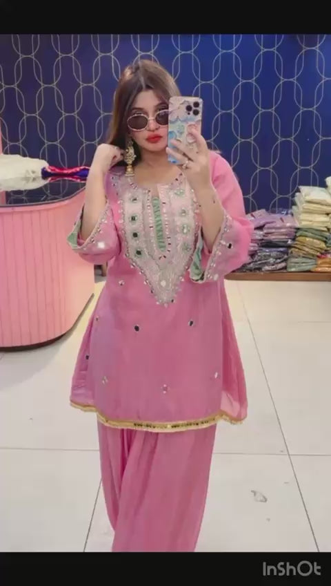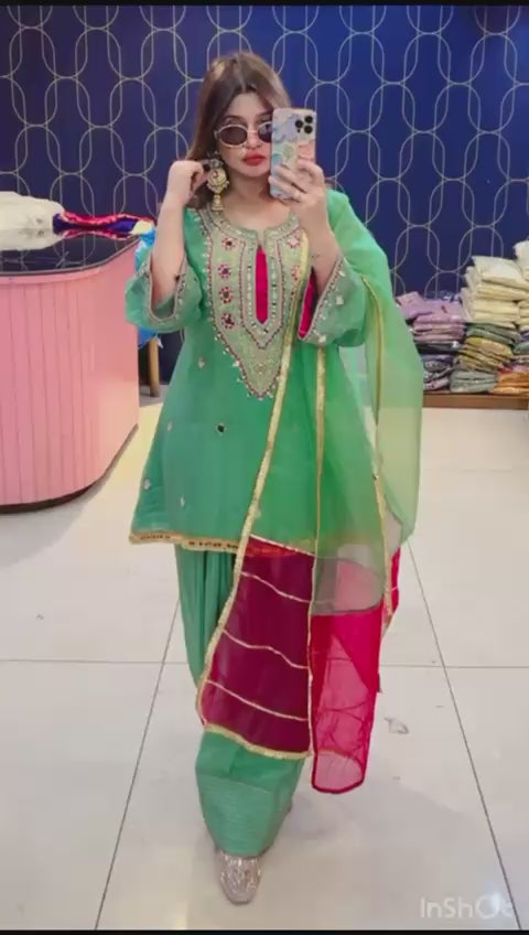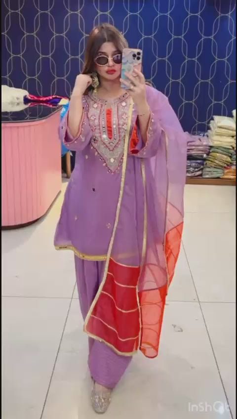Article 1911 – Pure Crepe Farshi Salwar Suit With Two-Tone Organza Dupatta & Mirror Work