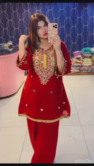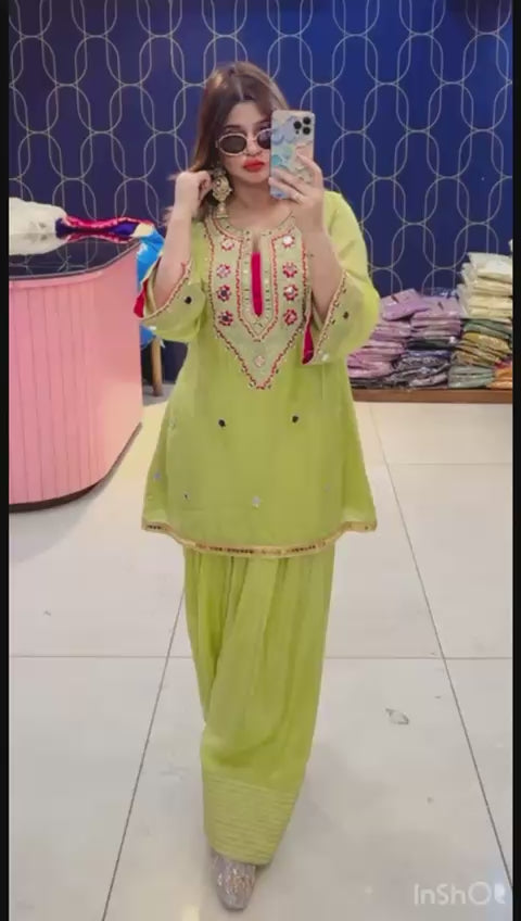 Beautifully highlighted with intricate mirror work, this ensemble is a perfect choice for weddings, festive celebrations & grand events.