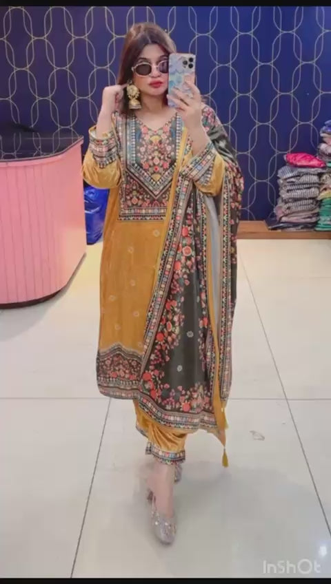 The outfit features elegant Pakistani-style prints and comes with a matching dupatta, creating a complete ethnic ensemble ideal for winter festivities, family functions, casual gatherings, and everyday elegant wear. The soft velvet fabric ensures warmth without compromising on style, making it a must-have for the colder season.