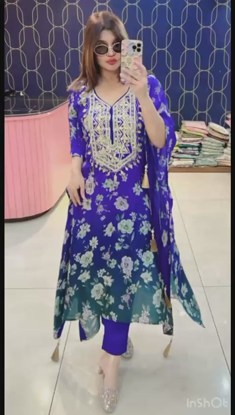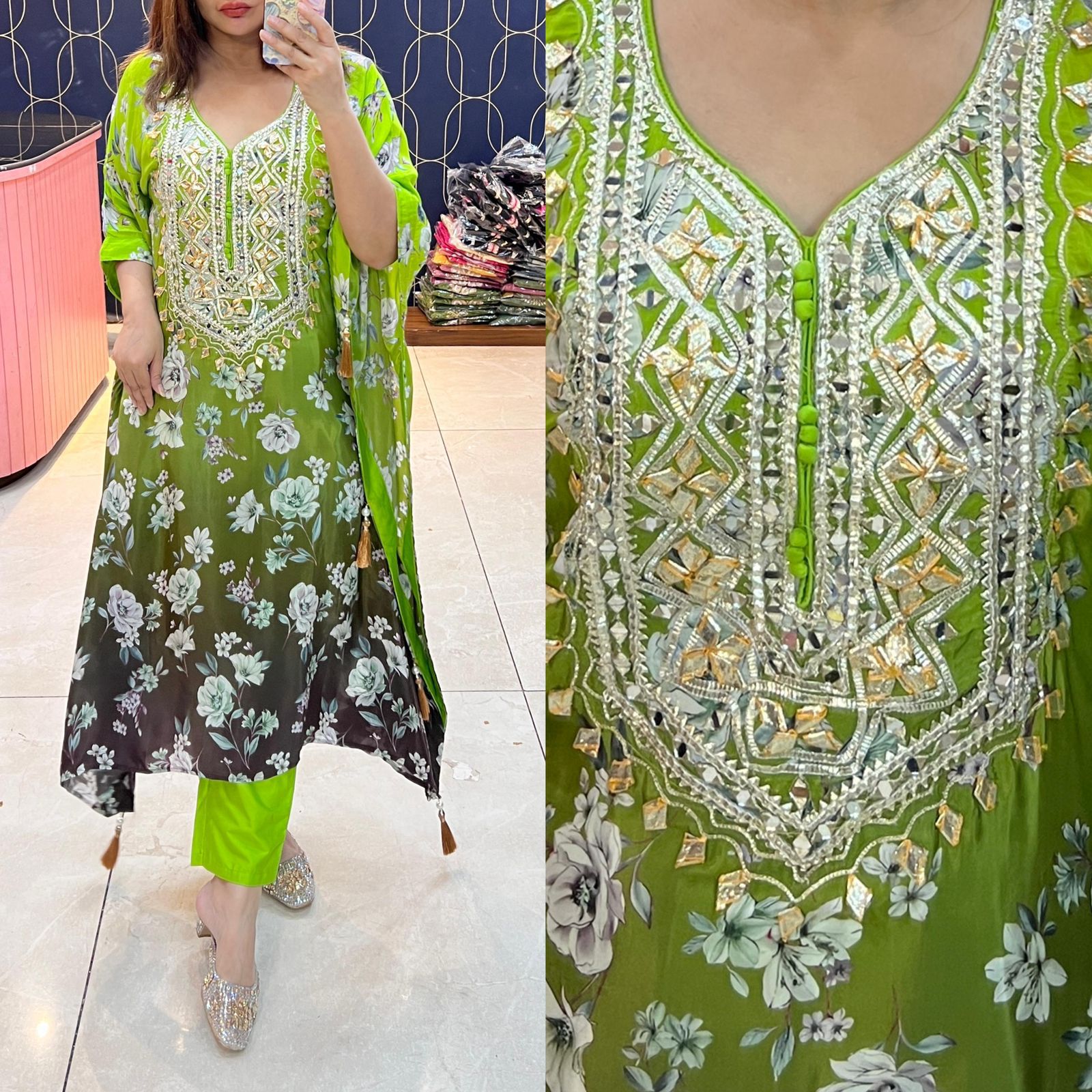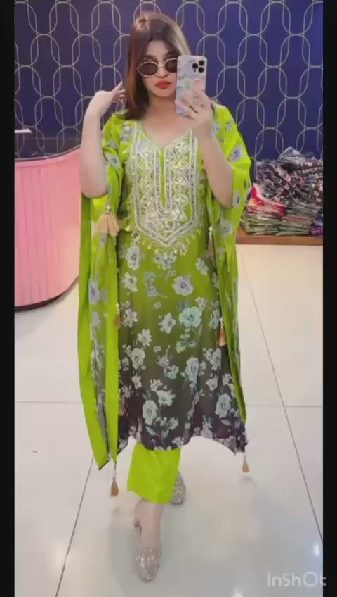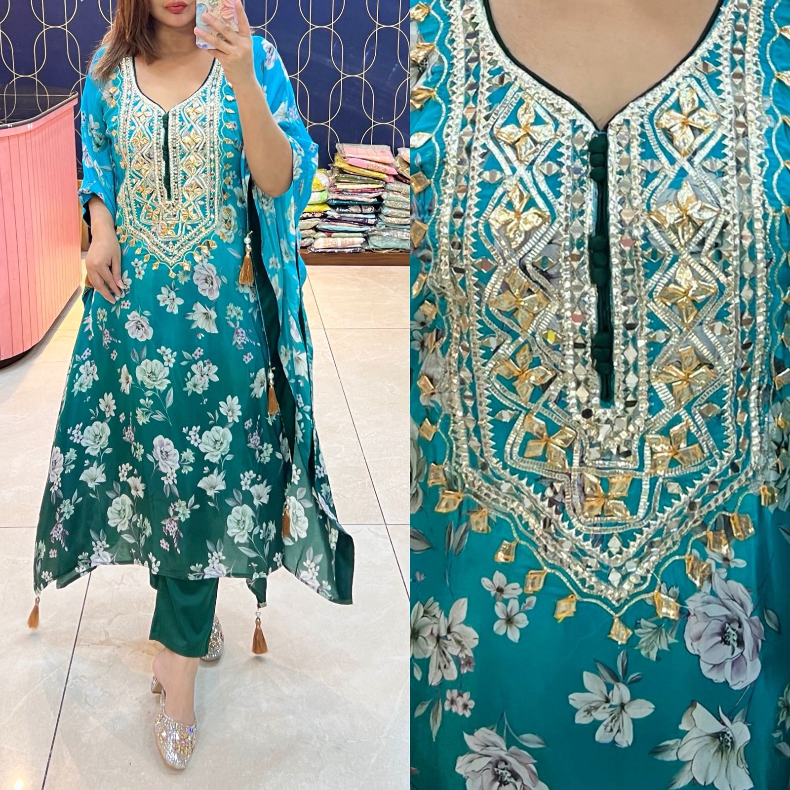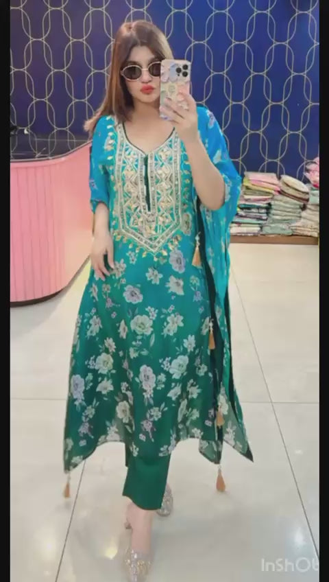 Step into timeless elegance with our Pure Crepe Fabric Kaftan Set, paired with matching bottoms. This luxurious outfit is highlighted with exquisite Gota Patti work, adding a royal shimmer to your festive look.