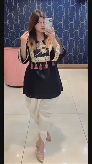 Shop Rutba Khan Article 2953, a premium imported cotton designer kurti with tulip pants, highlighted with intricate lace and handwork. A perfect choice for classy daily wear and festive styling. Available in sizes 40–46 exclusively at Urban Closet.