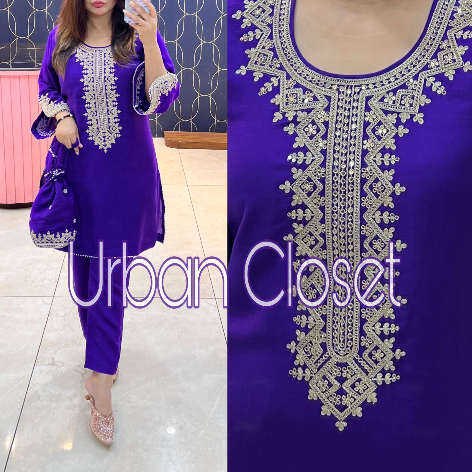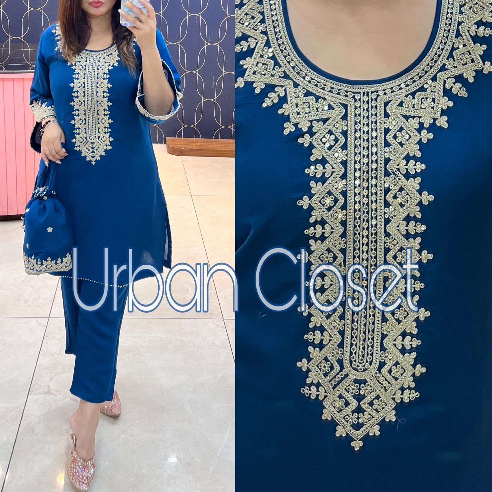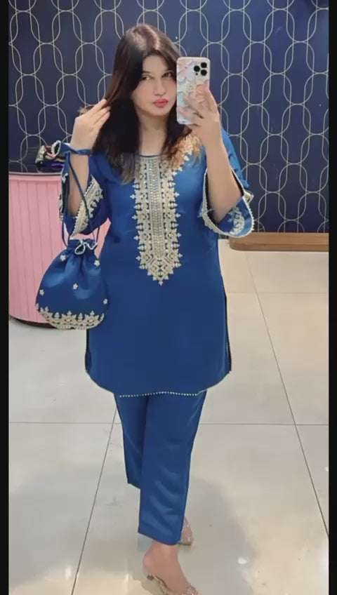 The 34-inch shirt provides a structured, stylish silhouette while the 39-inch bottom ensures a comfortable and flattering fit. Available in sizes 40, 42, 44, and 46, this ensemble blends modern comfort with timeless ethnic charm. The premium fabric, designer finish, and signature potli bag elevate your look effortlessly, giving you a complete, ready-to-wear outfit.